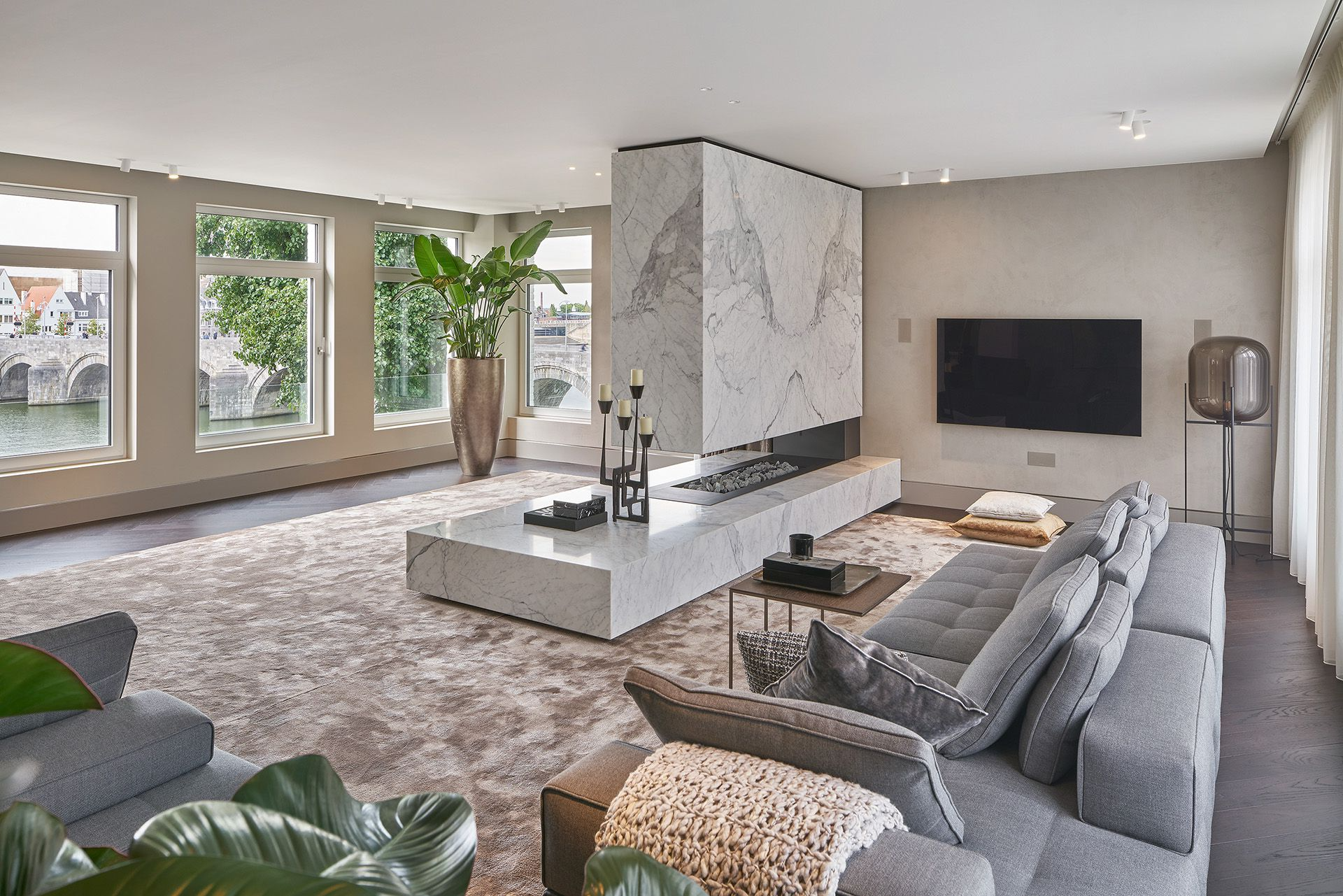 Идеальный вариант – каминная зона с растениями и нейтральным текстилем.